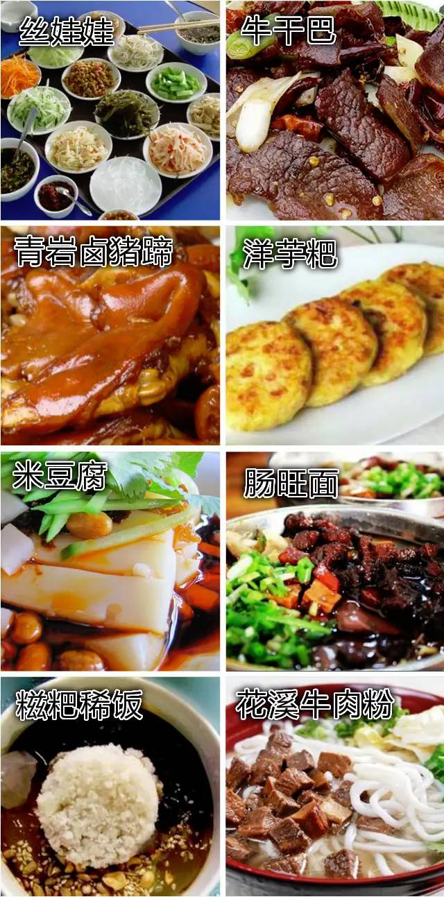 贵阳小吃有:肠旺面、花溪牛肉粉、丝娃娃、恋爱豆腐果、烤脑花、烤大排、酸辣烫、清水烫、豆米火锅、辣子鸡、糕粑稀饭……
