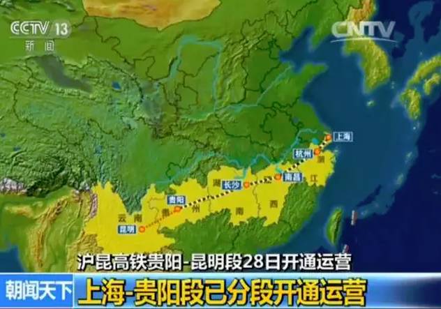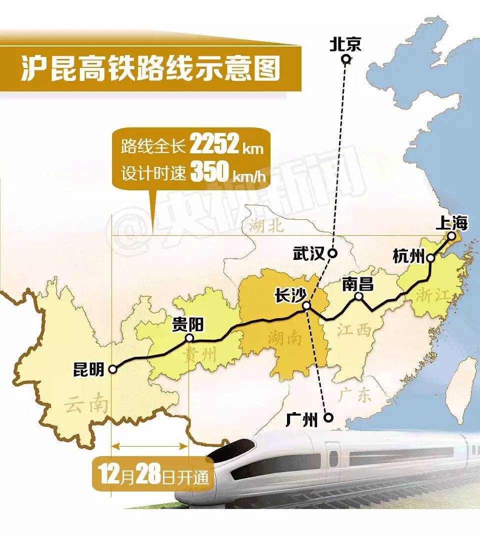 12月28日,上海至昆明高速铁路贵阳至昆明段将开通运营,标志着我国东西向最长高铁——沪昆高铁即将全线通车(上海-贵阳段此前已开通)。