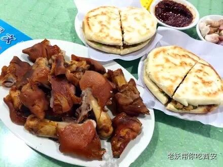 如果在西安哪个肉夹馍里夹上了青椒,那肯定会被吃货们骂不正宗。但在三原县城里的崔和平肉夹馍却以肉里又加了青椒出名,大多数去他家吃夹馍点名要加青椒,其实加点青椒也挺好吃的,这也就是美食的个人口味和习惯的不同。老崔曾在宴友思卤过猪蹄,所以腊汁猪蹄和猪尾也是他家特色。