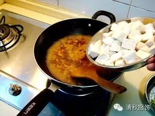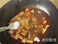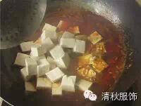 5.放入姜末、酱油、辣椒粉炒出红油后,再加入肉汤(或水)100克,倒入豆腐烧3分钟