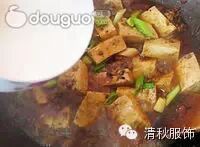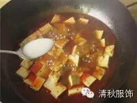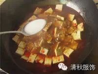 19.现在开始勾芡,勾茨分三次,因为豆腐本身有水分,勾一次茨,让豆腐吐一些水分出来,这样更好吃,这是第一次,把水淀粉拌匀用勺子慢慢地淋入锅里。