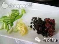 2. 姜切末、青蒜切段、豆豉和豆瓣酱剁碎。