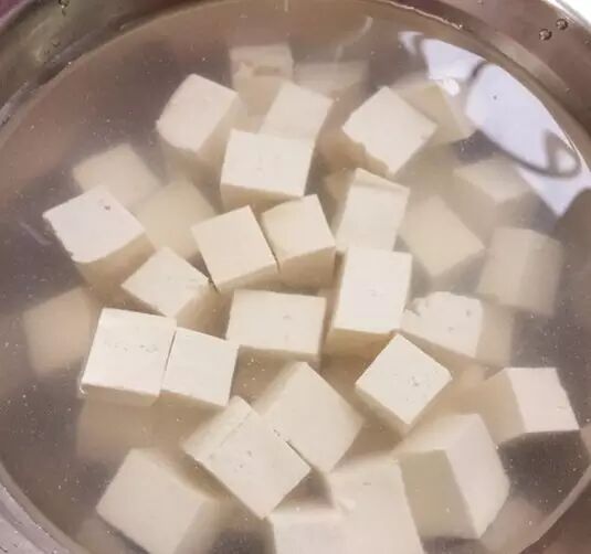 锅里倒水,加少许盐,然后放入豆腐,煮沸焯水备用。(焯水是为了去掉豆腥味,等到豆腐慢慢上浮,用手捏一下有一定牢度时候捞出来,这样豆腐不容易松散。)
