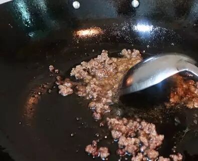 热锅放油,牛肉末煸炒,一直到呈漂亮的金黄色。(注意控制火候,否则容易变成炸牛肉末啊哈哈哈。)
