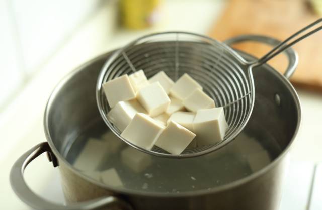 将豆腐洗净,切成1.5厘米见方的小块后,放入淡盐水中煮沸后,捞出过凉水,备用。
