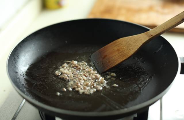 锅中放少许油烧至五成热,下牛肉末小火煸炒至变色后,盛出备用。