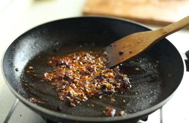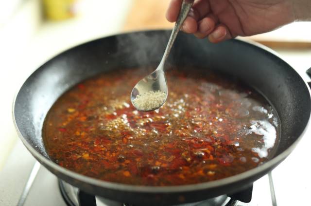 锅中再放余油烧至五成热,放入郫县豆瓣酱,煸炒出红油后,放入姜末、蒜末、剁细的豆豉炒匀。