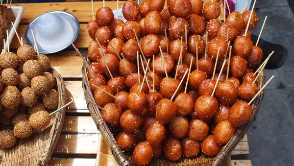 糖油果子是最最地道的成都小吃之一,一串有四五颗左右,每串约三元钱。它有股淡淡的焦糖味,表面有喷香的白芝麻,咬下去皮脆内软,焦香扑鼻。