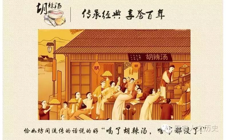 “靖康之难”后,净身未久的小宦官逃出宫,被一茶水摊老汉收留,用手中方子将老汉的茶摊改造成一种油茶,一直到现在在逍遥镇还可以喝到。后来,逍遥镇变成了金国地盘,金人爱吃羊肉,口味偏重,小宦官的茶汤原本不受待见,偶然一次因打翻了胡椒瓶,胡椒粉搅进锅中,金人食客们吃了都说好,胡椒既能御寒又能开胃,胡辣汤就这么诞生了。,胡辣汤的意思,就是“胡乱辣”,各种辣味加在一起的那种辣,除此之外,其他解读都是瞎掰。