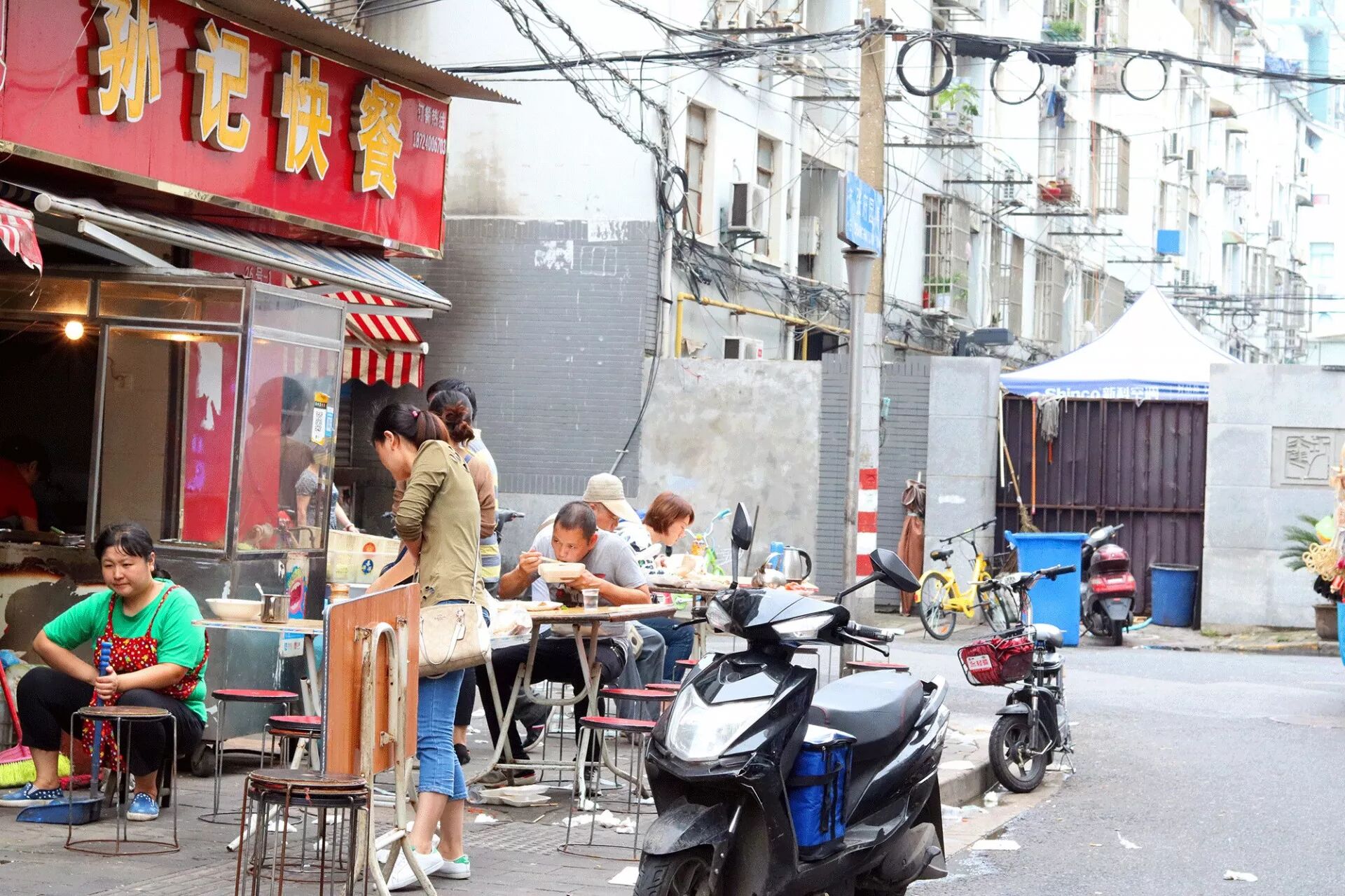 饭点的时候,快餐店门口放满了餐桌,颇有一种午市大排档的感觉。