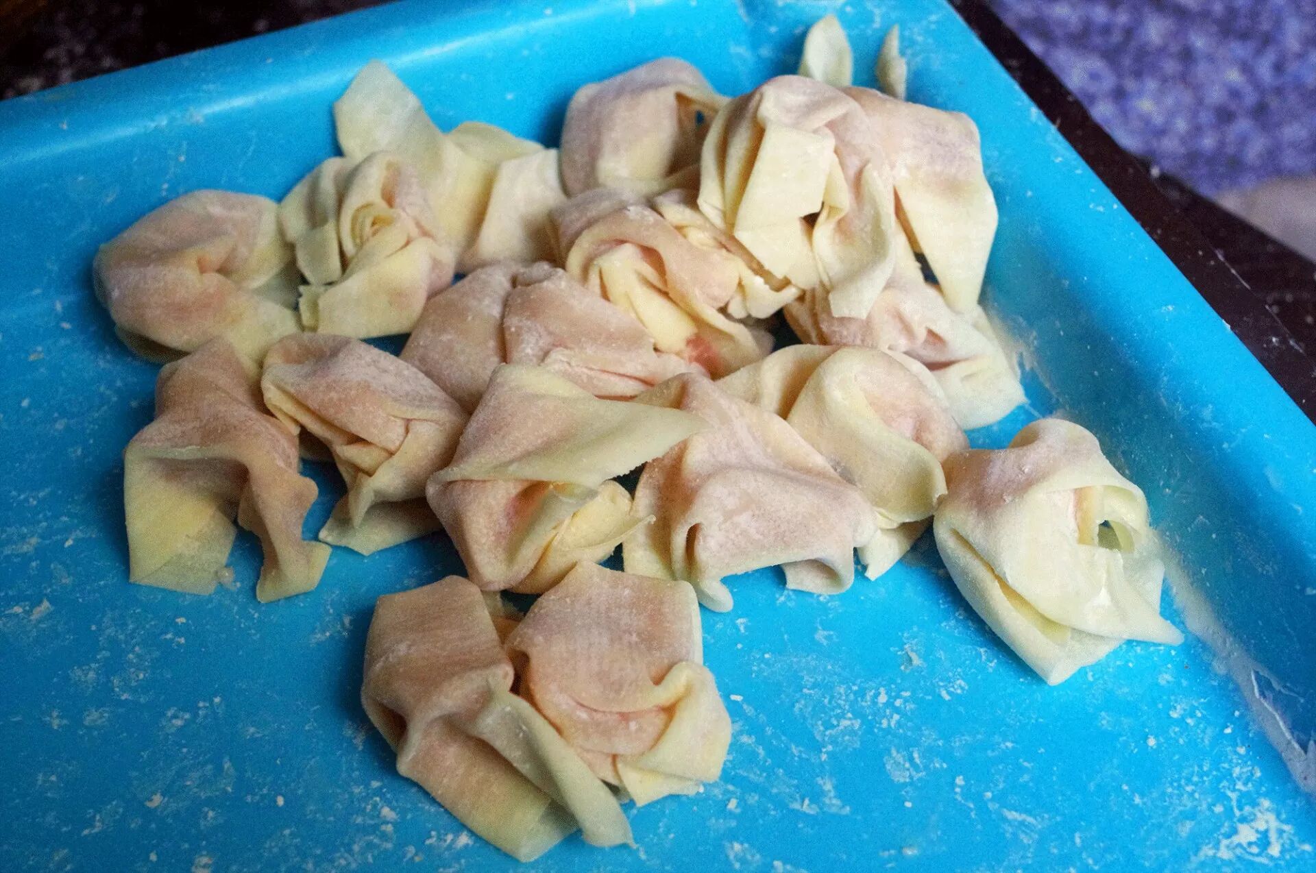 包馄饨的师傅永远拿着一小勺,面前一摊薄皮,一盆搅好的瘦肉泥,手速飞快,包好的小馄饨姿态各异,单单只是包住了里面的肉泥,毫无美感可言。