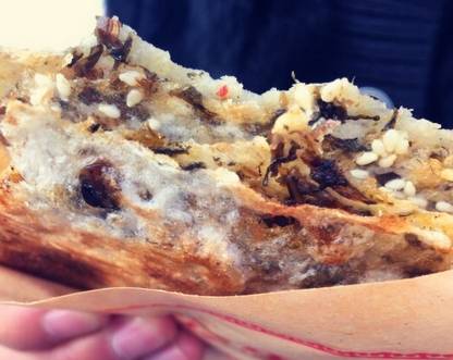 点点一般会买梅干菜扣肉味的,饼皮很脆,里面梅干菜咸咸的很香,肉也不腥气,热乎乎的吃最好,冷了就很难咬。
