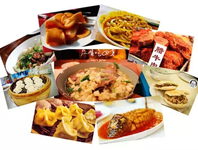 酱牛肉、羊肉泡馍、裤带面、肉夹馍、biangbiang面、灌汤包、饺子、葫芦头泡馍、