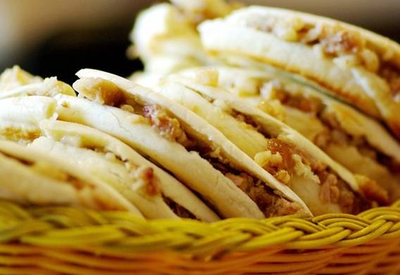 隐藏在案板街不足两平方米的一个小店,专卖芙蓉饼,不是熟人带路一定找不到。饼子由薄薄的三个小圆饼拼在一起,里有卤鸡蛋、肉碎、咸菜、香菜、豆腐皮、辣酱、蒜汁,裹成三角形,蘸一下辣椒汁递到顾客手里。吃客评价用料足味道始终如一,是逛街最佳充饥品。腐皮、辣酱、蒜汁,裹成三角形,蘸一下辣椒汁递到顾客手里。吃客评价用料足味道始终如一,是逛街最佳充饥品。老板就一个人,一心给你加工美食,旁边有个纸箱子,你自己把钱放进去,自己找钱。