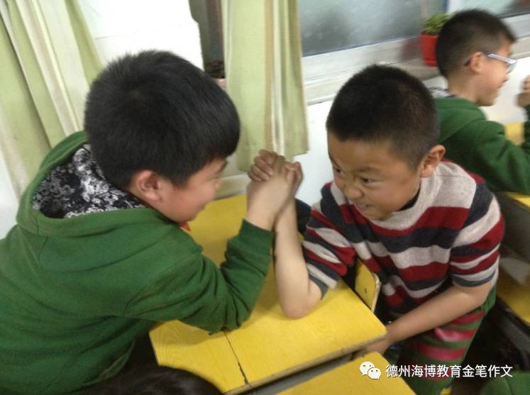 金笔作文的课堂总是让我们感到其乐无穷,集智慧与美丽于一体的庞老师总能让我们在轻松愉快中学会了写作文。这不,今天在金笔作文的课堂上,同学们又来了一次力量悬殊的扳手腕比赛。