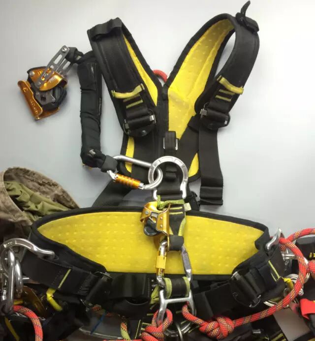所以防坠落安全带的胸前部位的结构强度必须很高,如果需要在普通防坠落全身安全带上安装胸升可以按照我的安全带连接方式,下图中你可以看到胸升只起到悬挂身体重量的作用。胸前防坠落挂点是和下方的主锁连接。