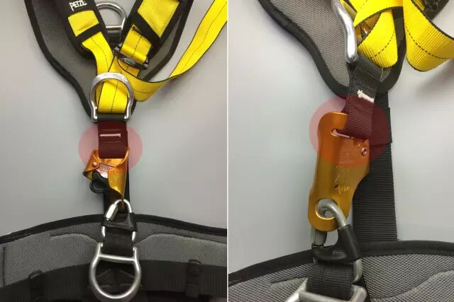我见过有人以左图的错误方式连接过胸升, (包括国产的山寨品牌),当发生坠落时,普通胸升的上连接孔很可能会发生断裂。全身安全带的胸部止坠挂点的强度要求15kN。