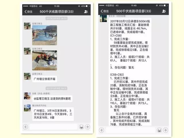 在任务量大,时间紧的情况下,高效的沟通是加快项目推进的又一有效手段。为了加强讯息沟通,项目部建立了每个工程的微信工作群。在微信上,分包单位负责人将现场事情以图文信息方式第一时间回传项目部,在进行梳理之后,项目部马上就能根据情况制定措施或解决方案,从而大大提高工作效率。另一方面,业主能够及时地了解工程建设中遇到的难题,确保工程有序推进。