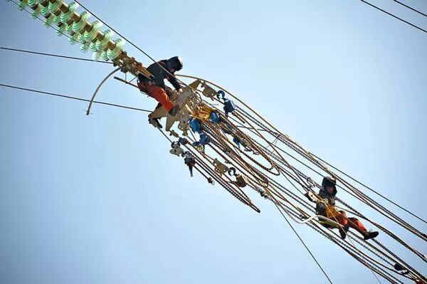 “高空人员注意安全,安全绳绑扎牢靠站稳了。”随着绞磨的提升,悬浮抱杆将硕大的横担提升到了90米的高空。负责浪风绳牵引人员目不转睛地看着半空,地勤人员随口令不时地调整横担与结合部的距离。高空人员手拿尖板手首先将螺丝孔定位,塔上四根塔腿八个人,以其娴熟的安装手法,相互配合协调着开始了横担就位。临空传来一阵工具跟塔材的碰撞声。发力声、督促声参杂着大声呐喊,横担在按部就班中已就位。“横担安装就绪!”这基塔全高97米,重量百吨的铁塔经2400根塔材、21000个螺栓的结合、紧固,在施人员汗水摔八瓣的艰辛中将矗立而起。