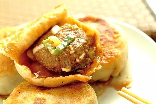 肉饼是现做的,上得比较慢。肉馅很实在,肉料很足,咬上一口肉香和葱香袭来,还有爆浆的感觉。肉馅多,沾点醋吃还能解油腻。肉饼的个头不大,一个人,吃上两三个肉饼,喝一碗疙瘩汤,就心满意足啦!
