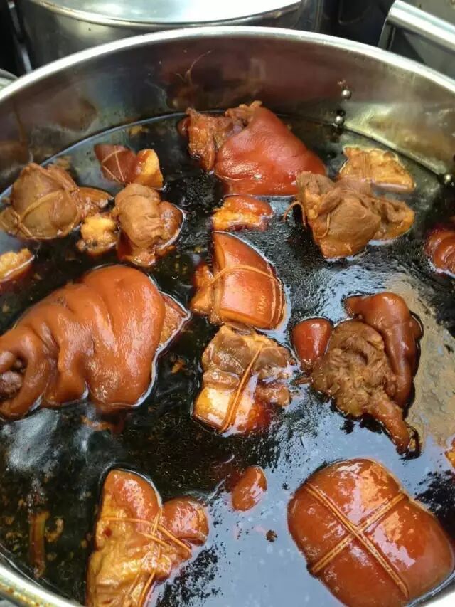 猪蹄有专门的老汤,这么多年一直保存下来,肉越卤越香,而肉的精华也在滋养老汤。猪蹄下汤,卤得耙烂,从里到外都透着蛋白的香气。从卤汁里一捞,浸出味足的卤汁,此刻的美赛过出水芙蓉。
