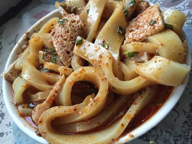 店里的酿皮扎实柔韧,滑溜溜的一口吸进嘴里,香辣可口。