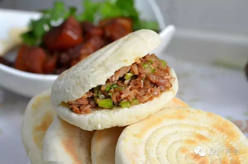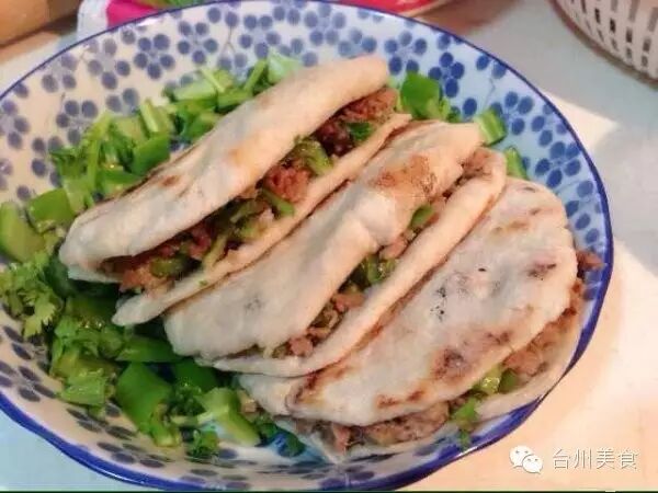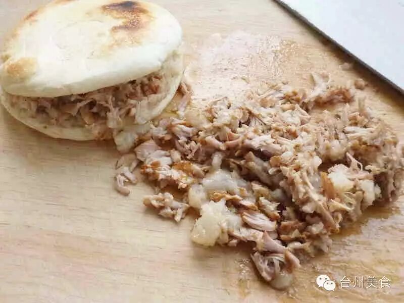 9、把烤好的面饼,用刀在一边划开至3/4面饼,夹入切好的酱肉碎、青椒碎、撒上香菜末,淋上一匙肉汁,再来点红油即可。