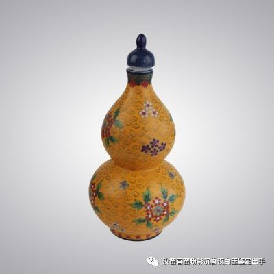 此件黄釉地掐丝珐琅葫芦瓶,黄釉呈现宫廷皇家专用帝王色,黄中冷金红艳,尽显皇帝气韵。釉层肥厚、莹润,闪发丝质内敛光泽上下主题,选用进口珐琅料、金线掐丝,绘折枝琼花纹工艺复杂。掐丝平稳流畅,珐琅料表层,泛红、绿宝石光泽,年代久远,釉面光泽内敛,但尽显历史沉淀、稳重、古朴、典雅之皇家风范,瓶盖用霁蓝釉方色剂,如蓝宝石莹润柔和,底部用青花书写大清弘历年款,釉里红书六字贡酒名签,其瓶置名酒,为宫廷专用。造型到釉色代表清中期珐琅彩的最高成就,民间少见,具有很高的收藏和经济价值。