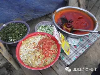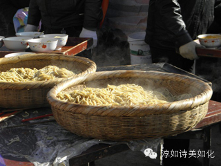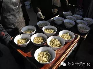 淳化人把吃饸饹不叫吃,而叫“吸”,对于一个年轻人来说,吸上八九碗饸饹那是很正常的。淳化人讲究吃饸饹贵在吃汤,关键是汤要好。过事的时候,不论贫富都要杀猪宰羊,在汤里面佐以羊肉汤,将辣面用清油烧热之后熬到一定火候,一股香辣扑鼻,再放入豆腐等臊子,细细搅匀,添上清水,再加入大料熬成的水。汤滚开之后,再放入香菜末、葱花,那不吃看着也是一种享受啊!