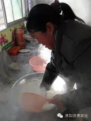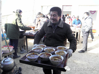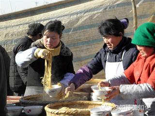 妇女们手抓着将饸饹盛在碗里,要求饸饹要适量,不可多抓,否则汤少饸饹多,吃起来不爽口。
