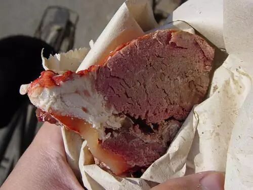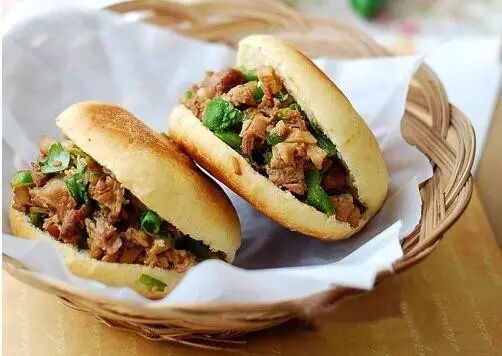 肉夹馍是陕西著名小吃,馍外观焦黄,条纹清晰,内部呈层状,饼体发胀,皮酥里嫩,火功到家,食用时温度以烫手为佳,且老潼关肉夹馍是热馍夹凉肉,饼酥肉香,爽而不腻。
