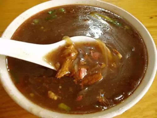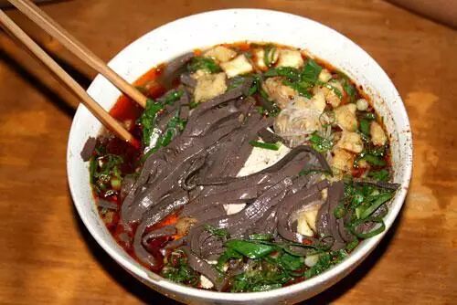 粉汤羊血是陕西地区汉族传统名吃之一,由制血、配调料和泡馍三个步骤精制而成。食时配以粉丝、香菜等辅料。羊血鲜嫩、粉丝光滑筋软、辣香扑鼻。寒冬食用为最佳。