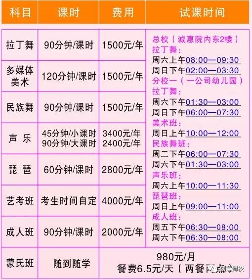 少儿拉丁舞、摩登舞、民族舞、声乐、钢琴、琵琶、多媒体美术、跆拳道、街舞、成人班、高考艺术班、幼儿蒙氏班等。