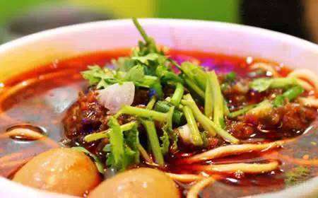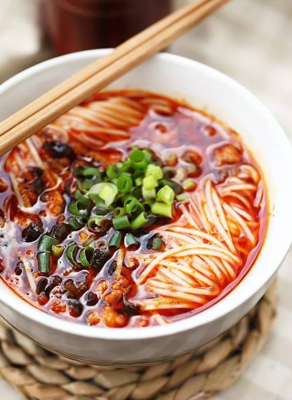 5.另起一汤锅将面条煮到约八成熟后捞出盛在碗中,加入之前煮好的料,烫好的青菜,加入香醋、花椒粉、红油、芝麻、香葱拌匀即可。