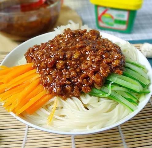 7.将煮好的面条沥干水分,放放入碗内,然后浇上炒好的杂酱。搅拌均匀即可食用。