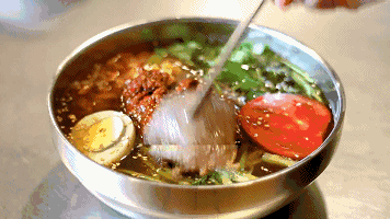 用荞麦面或小麦面的圆面条,煮熟后浸以冷水,再去冷水伴牛肉片、辣椒、泡菜、梨或苹果片、酱醋、香油等佐料,加入牛肉汤即成。冷面的魅力在何处?在它入口后,柔韧耐嚼,凉爽清淡~