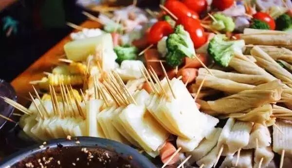 冷沾沾是绵阳特色休闲小吃,听名字就知道这个是吃冷的蘸酱吃,桌子上摆满了各自吃的,荤素都有,用牙签穿好各自食材沾着红红的酱料,这辣味很带劲,你可以尽情享用美食。