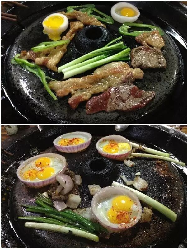 这种几天不吃就会想念的,只有烤肉了!有些烤盘周围有一圈可以油炸,凉粉、土豆、蒜香排骨先放在外围炸一下再烤来吃才是正确的打开方式~洋葱圈烤鹌鹑蛋更是真爱~