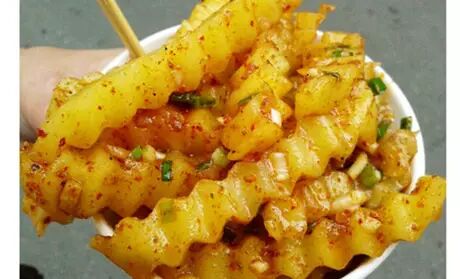 狼牙土豆简直是小吃中的最爱!麻辣、糖醋、泡椒之类的,选择障碍的只有把每一样都选一遍了!!土豆辣ferfer的很入味,根本停不下来~一定要加销魂的折耳根~我觉得粉粉的比脆脆的土豆更爽哦~