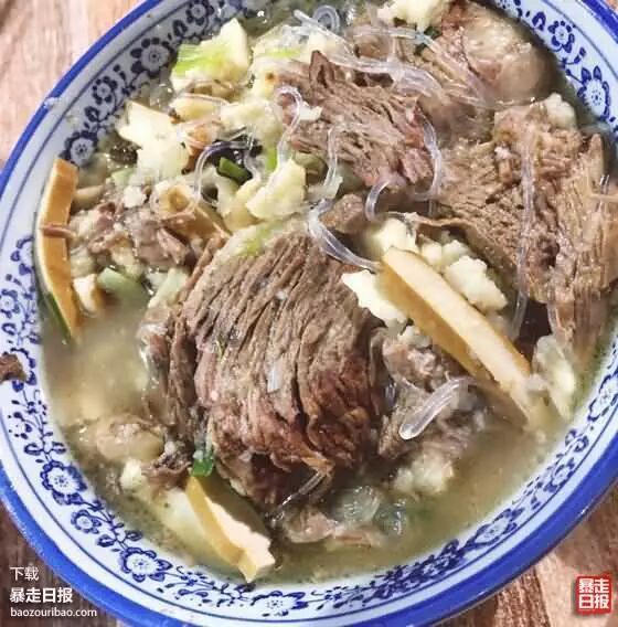 牛羊肉泡馍中的肉必须呈“双鱼状”铺在馍上,粉丝盖在肉上。