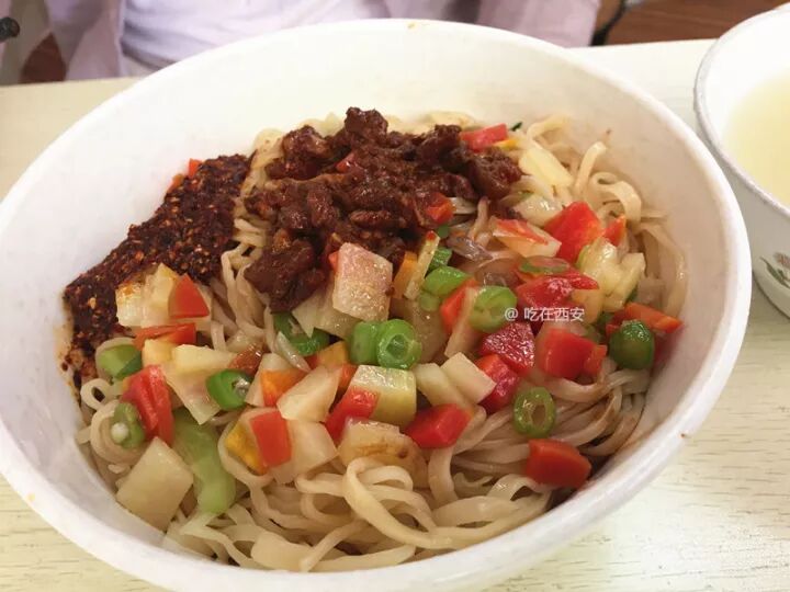 biangbiang面跟上面的揪面片又不一样了(所以说,西安人吃面真的是花样多),要一整条面齐齐整整的,薄厚均匀,有时候配个肉臊子,有时候浇个西红柿鸡蛋,西安人就爱这一口实在的。