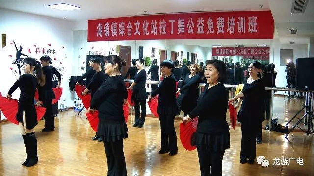 夜幕降临,湖镇镇综合文化站里灯火通明。上百位村民手里拿着红色折扇,脚下踩着有力的舞步,在宽大的一楼大厅里跳着热情洋溢的拉丁舞。