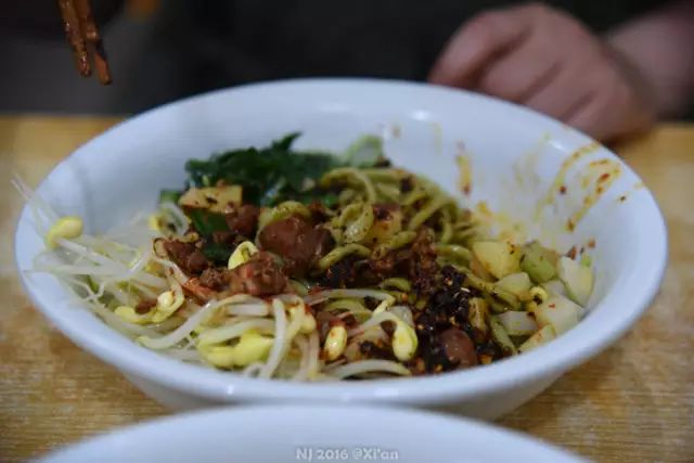 加入适量肉臊子和油泼辣子拌匀后开吃。