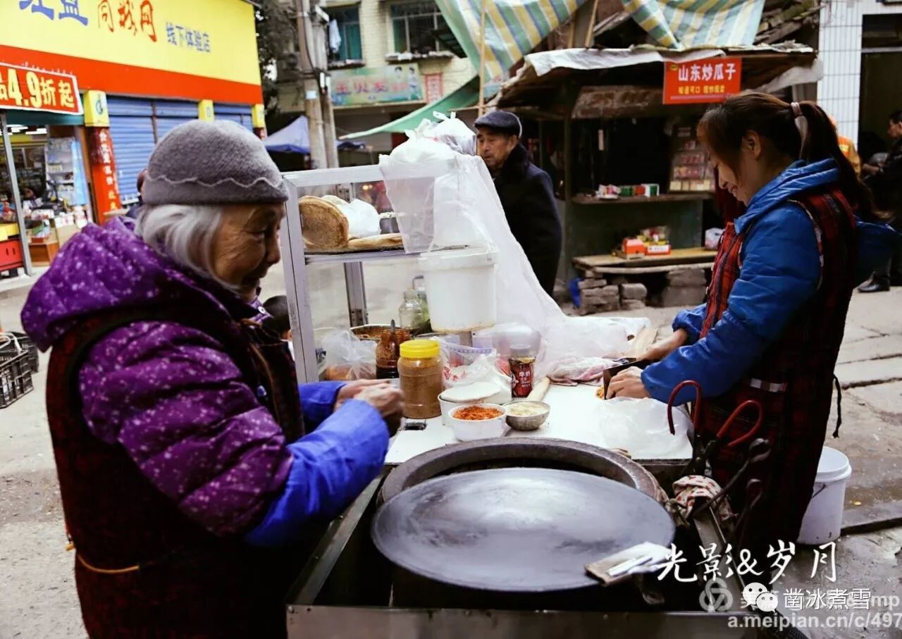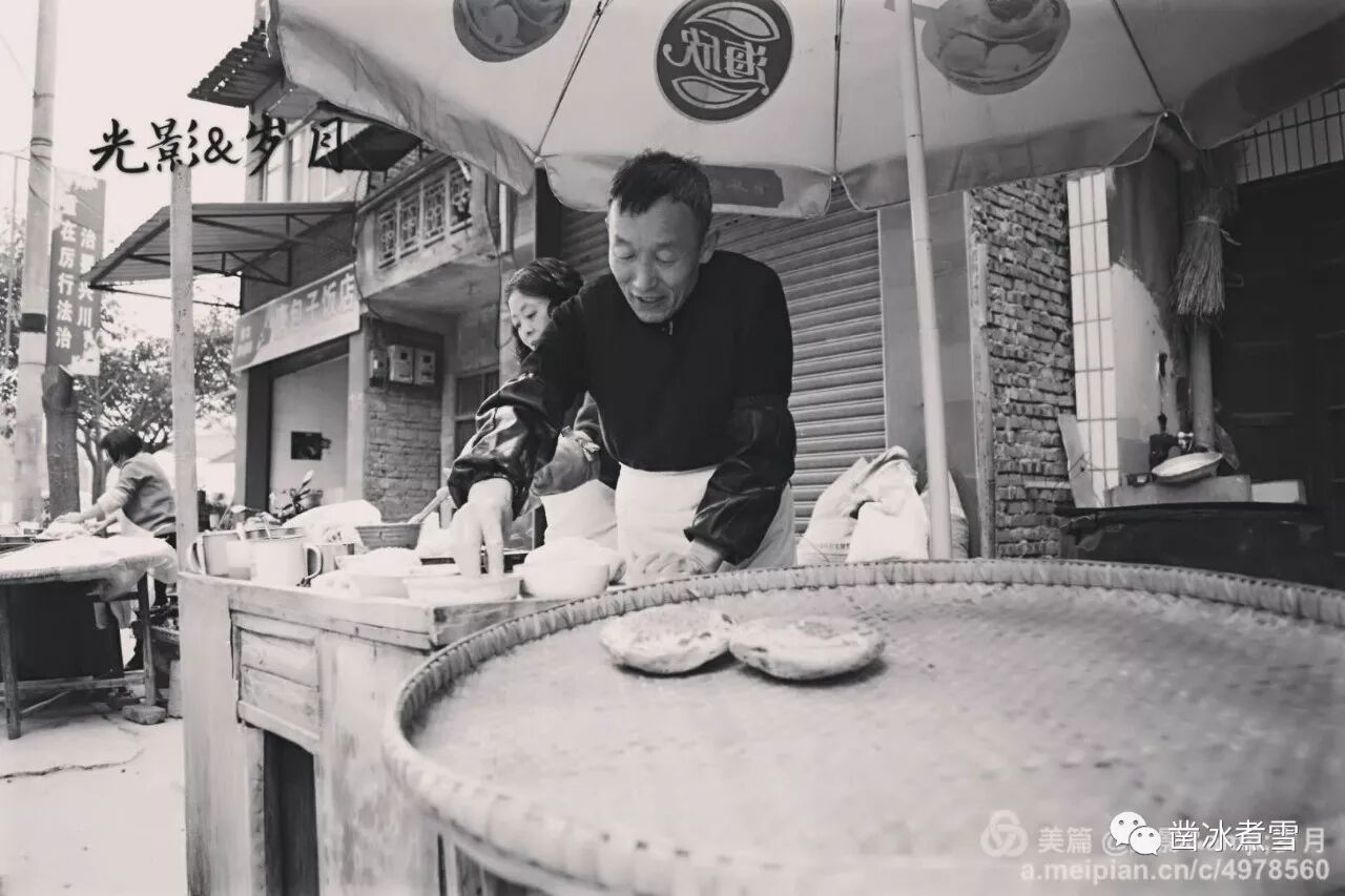 临水的小镇,一抹阳光斜照在街头的锅盔摊子……