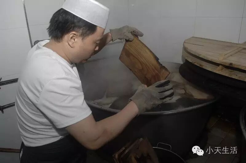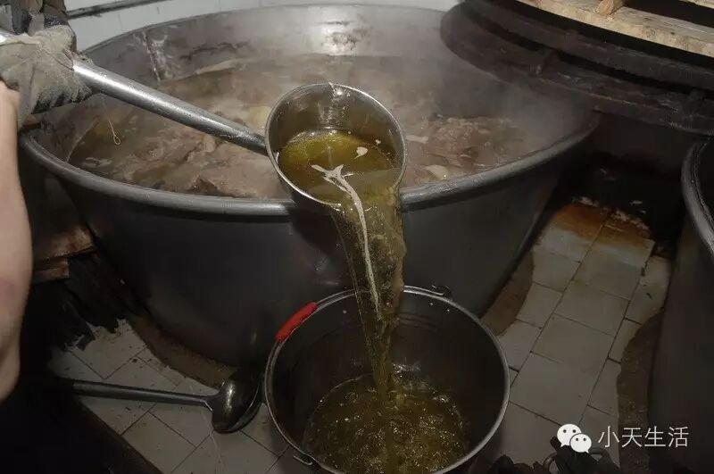 先将锅中的肉汤用桶舀出来一部分稍后备用。