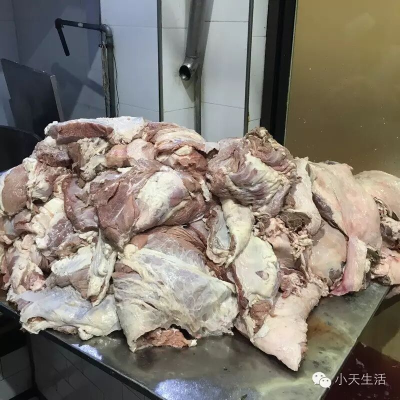 这堆一百多斤的羊肉是这口锅里的用量,同样也是泡过冷水的,可以看出来基本上都是腿肉。
