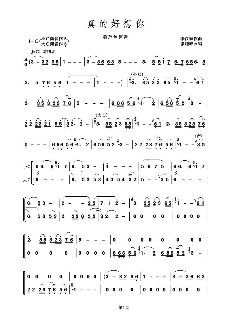 此曲谱是双葫芦丝曲谱,但也可以独奏;独奏时只需省略”大C“葫芦丝吹奏的部份即可。