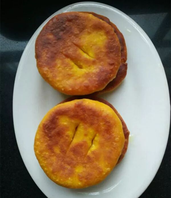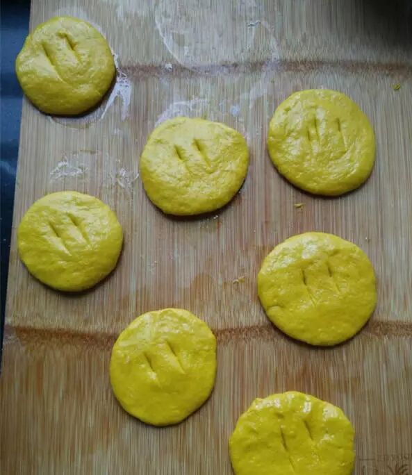 擀成小圆周饼,薄厚适中。为了防止入油锅起泡,用刀在面饼中间划开两道口。![]()