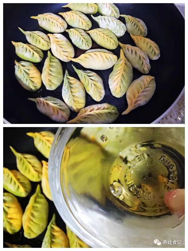 8、平底锅滴入少许油,把柳叶饺子码上,小火烙2分钟左右,饺子底部变硬即可。然后倒入半碗清水,水量不要没过饺子,到饺子的二分之一处即可。
