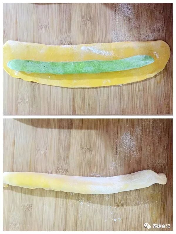把黄色面擀成长条形面片,里面裹绿色的椭长形的绿面。